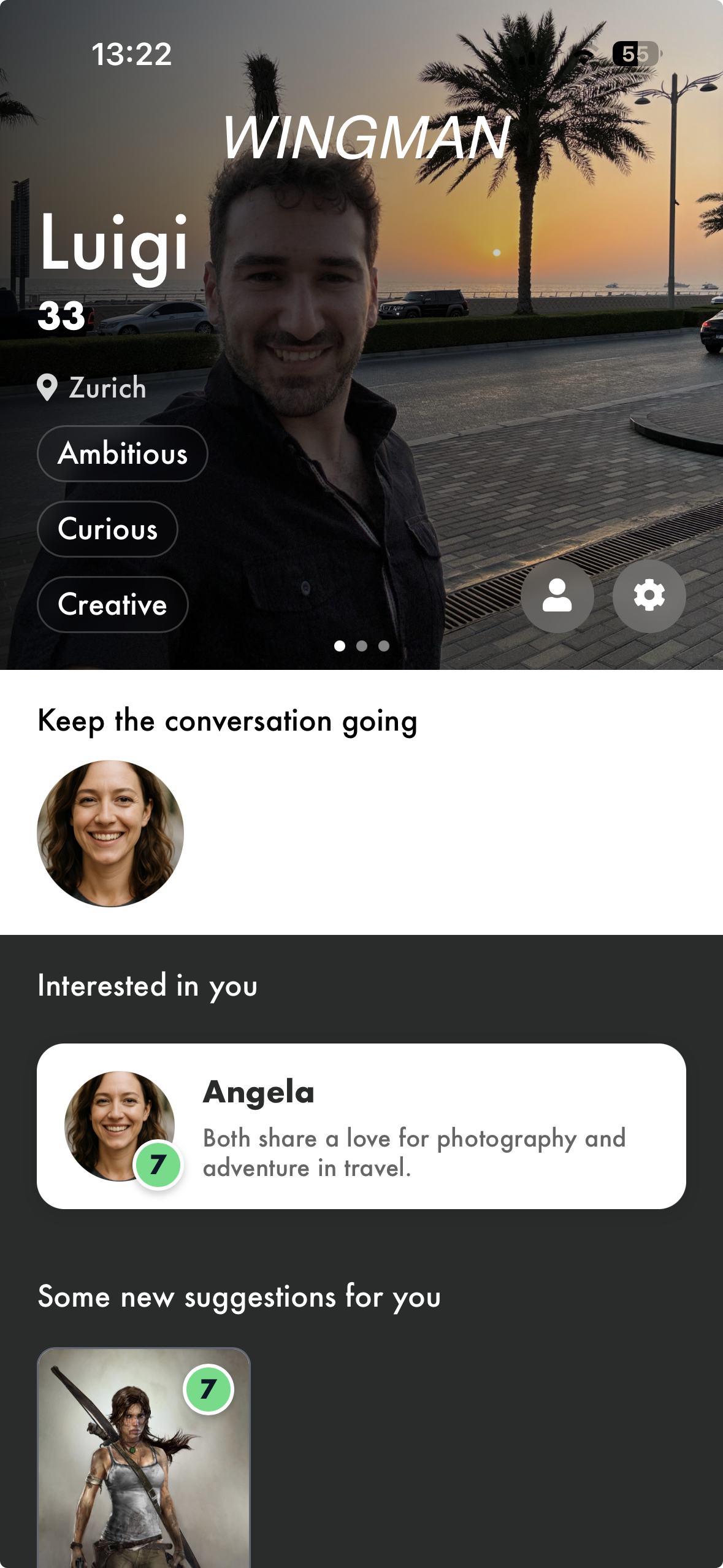 Matching in Wingman is curated and limited. Users don’t browse hundreds of profiles. They receive a small number of high-quality matches computed by the system, with clear explanations of why a match exists. The goal is to shift the mental model from “shopping” to “considering”.